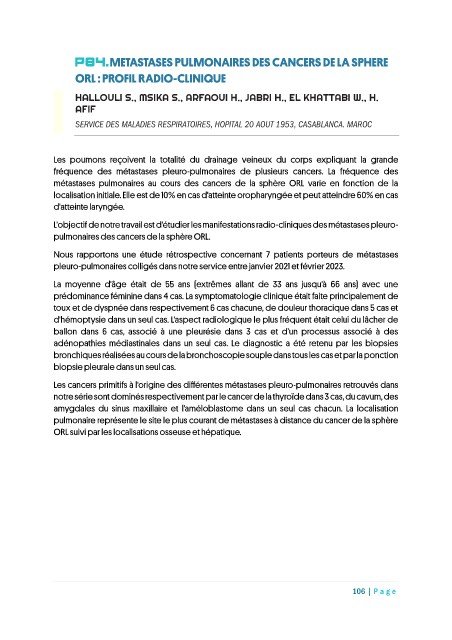 P84.METASTASES PULMONAIRES DES CANCERS DE LA SPHERE